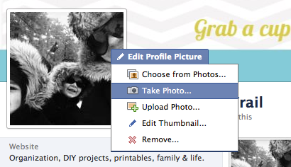 Your profile picture should not be any smaller than 180 x 180 pixels, however keep in mind facebook will shrink your profile picture down to 160 x 160 pixels. To change the profile picture, you will be doing the exact same as you did with the cover photo. You even have the option to take a photo with your computer, so pucker up (or not).