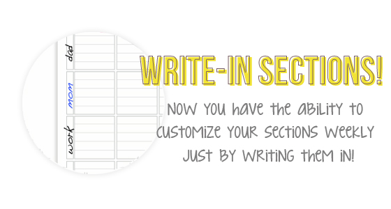 Say what? Yup… now you have the ability to customize the sections with whatever your heart desires. It’s up to YOU. If next week you want to change the section, you write it in. If you want to color code the section, you just color the box in. Isn’t that exciting!